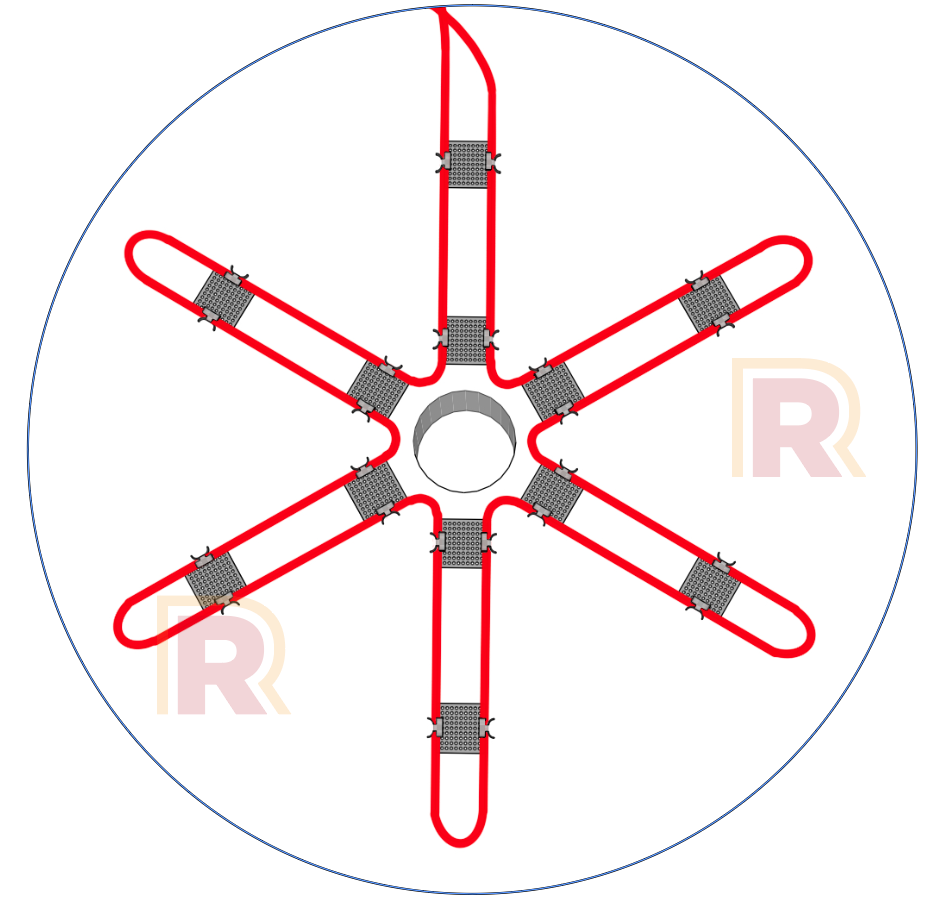 - 3-6 cable loops radiating outward from the drain like spokes